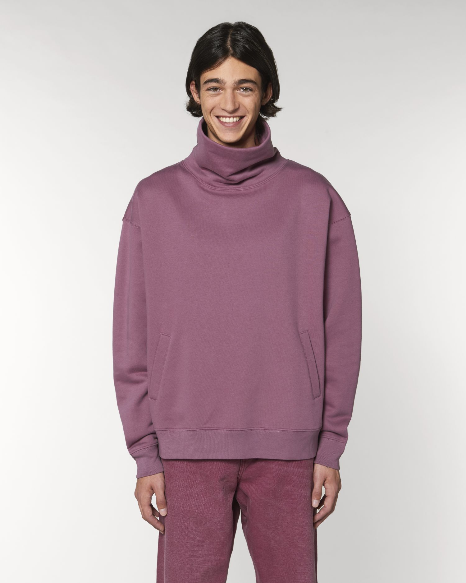 Unisex mikina s lievikovým výstrihom. Oversized, rolovací výstrih, dlhý rukáv, česaný fleece. Priliehavé rukávy Spadnuté ramená Golier podšitý hlavnou látkou Vnútorný šikmý džersejový úplet na krku 1x1 rebrovanie na manžetách a spodnom leme Dve polmesiace v hlavnej tkanine Dvojité prešívanie, manžety na pleciach a na pleciach vpredu_Dvojité prešívanie000D ramená00D00