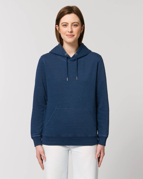 Unisex džínsová mikina s kapucňou. Normálny strih, okrúhly výstrih s kapucňou, dlhý rukáv, nečesaný fleece. Uzavreté rukávy Kapucňa podšitá hlavnou látkou Okrúhla sťahovacia šnúrka v rovnakom tóne, zakončená kovovými koncami Kovové očká Šikmý džersejový steh vo vnútri výstrih Polmesiaca vnútri v hlavnej tkanine Golier a zapínanie na jeden steh00_hexD00 zapínanie na stehno a rebrovanie0Dx1x00 Dvojitý steh na pleciach, manžetách a spodnom leme Klokaní vrecko Zhoršený efekt na všetkých švoch Odev farbený indigom, vzhľad každého odevu sa môže líšiť, farba môže vyblednúť, dodržujte náš štítok starostlivosti Pozorne si prečítajte odporúčania týkajúce sa dojmu