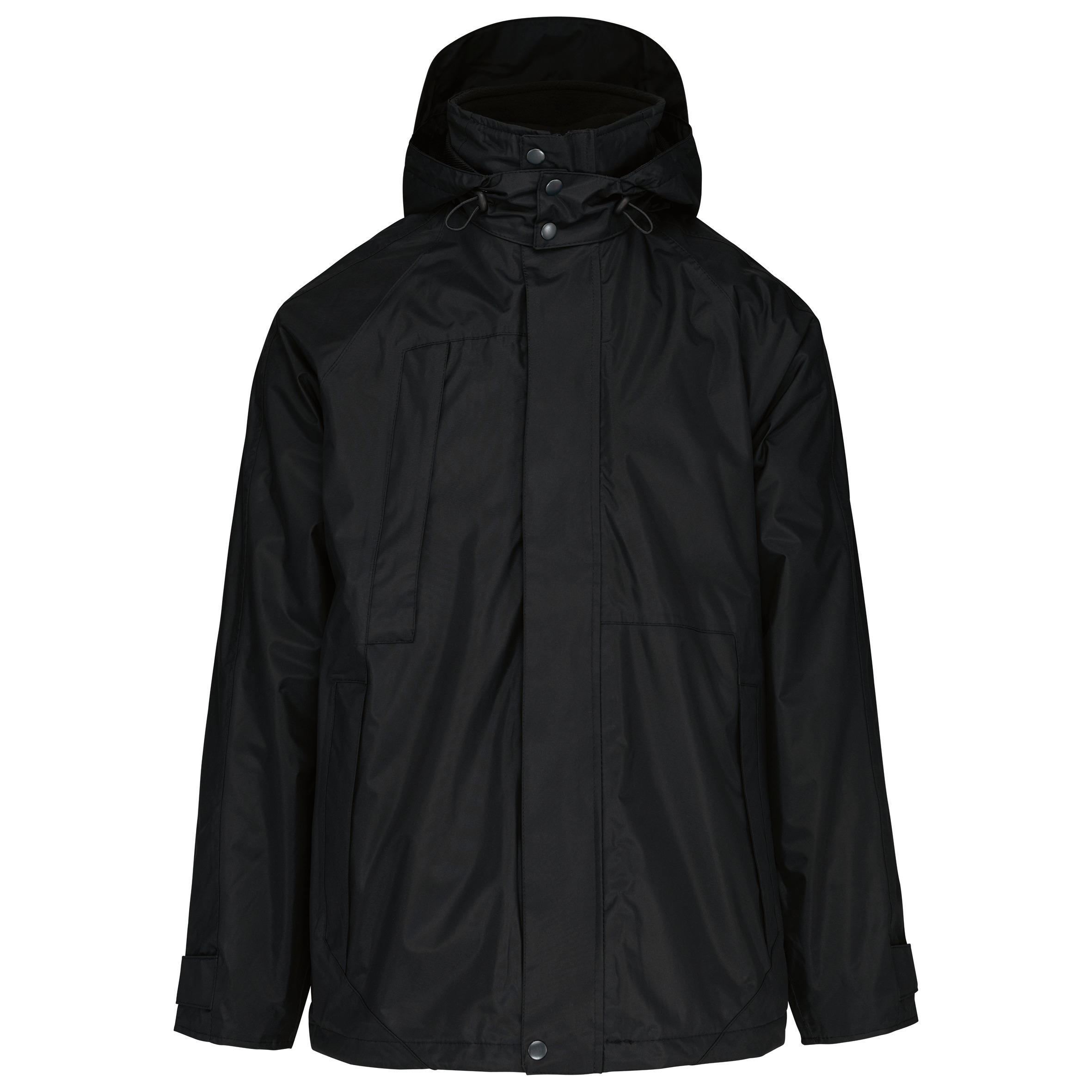 Vonkajšia časť: 100% polyester s PVC záterom. Vodeodolné podlepené švy. Parka 3 v 1: prešívaná z 2 materiálov. Telo: 100% polyesterová sieťovina. Rukávy: 100% polyester. Zapínanie na zips a chlopňa s patentkami. Vnútorná fleecová podšívka okolo krku. 3 predné vrecká so zipsom a chlopňou. Nastaviteľný popruh na manžetách. Odnímateľná kapucňa so zapínaním na patentky. Kapucňa podšitá sieťovinou a zapínanie na stopky. Vnútorný zips pre jednoduché prispôsobenie. Fleecová bunda: 100% polyester microfleece. Podšívka paží z polyesteru na uľahčenie priechodu paží. Zapínanie na zips. 2 bočné vrecká. Odnímateľná mikrofleecová bunda so zipsom. Priemerná hmotnosť vo veľkosti L: 1550 g. PVC záter a tepelne zvárané švy, ktoré poskytujú optimálne utesnenie.