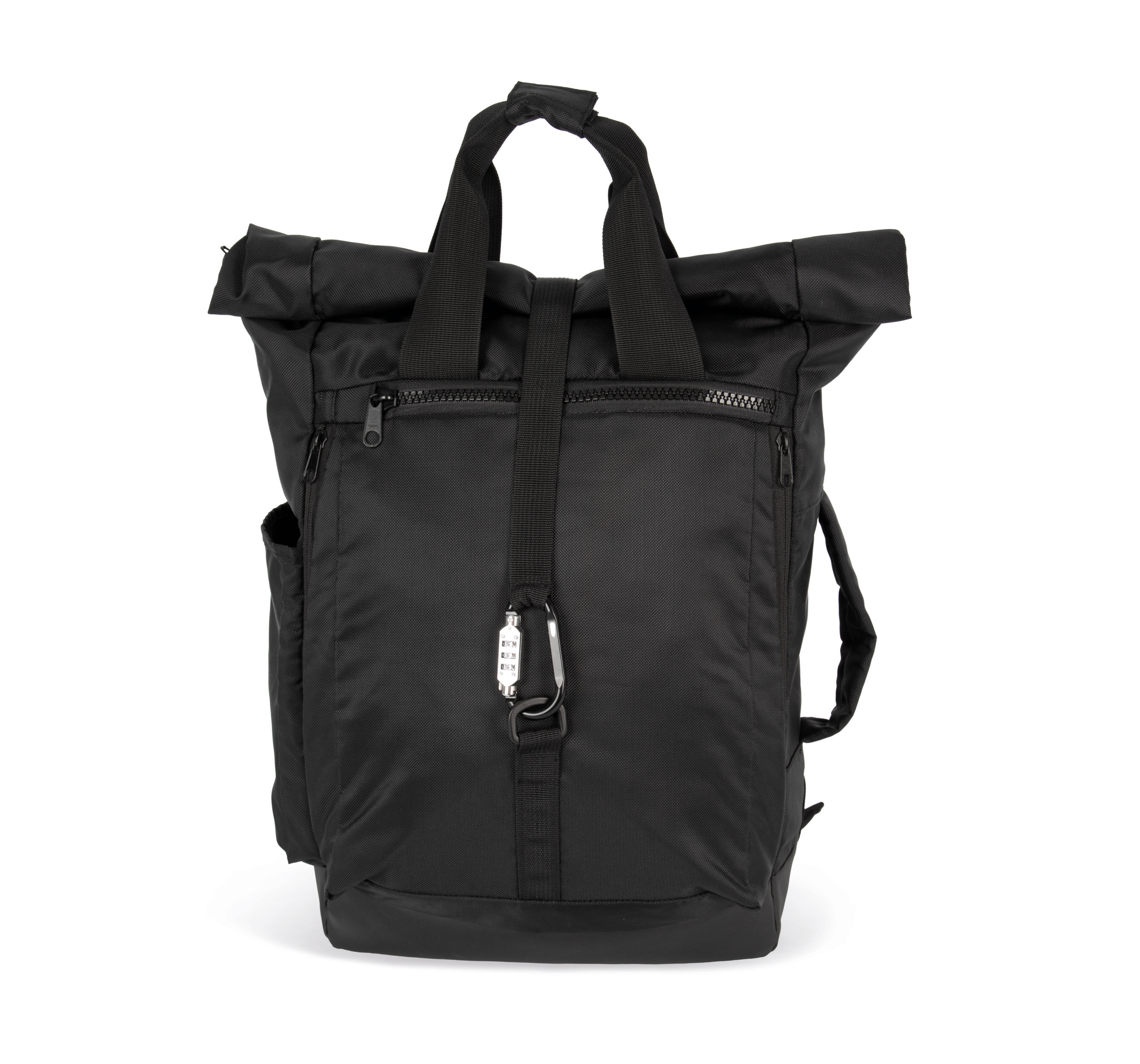 100% polyamid. Športový batoh s káblom proti krádeži a karabínou s číselným kombinačným zámkom. Integrovaná a odnímateľná taška cez pás. Horné zapínanie na zips. Pre väčšiu bezpečnosť rolovacie zapínanie a bezpečnostný pásik pripevnený ku karabíne. Veľké predné vrecko, ktoré sa dá ľahko prispôsobiť, držiak na topánky s bočnými otvormi pre lepšie vetranie. Vnútorná polstrovaná taška na notebook. Úložné vrecko so zapínaním na zips na vrchu. Polstrovaná bočná rukoväť a horná rukoväť so zapínaním na suchý zips. Taška na opasok na prenášanie cenností sa zapína pomocou patentného gombíka na vnútornej strane chrbtového panelu, ktorý možno použiť v batohu vďaka nastaviteľnému opasku s prackou.