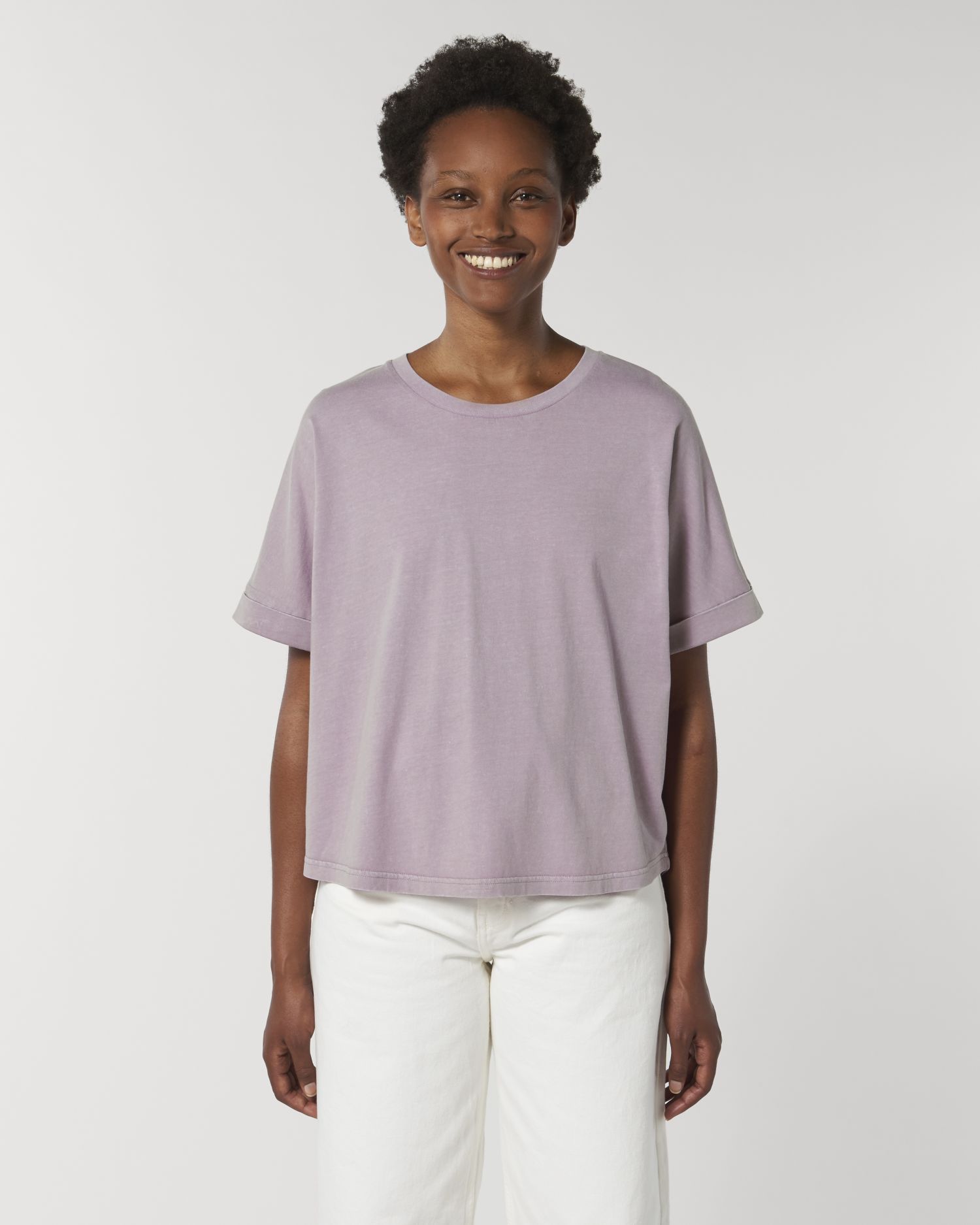 Zafarbené tričko s rolovanými rukávmi pre ňu. Oversized, výstrih, krátky rukáv, jednoduchý džersejový úplet. Netopierie rukávy