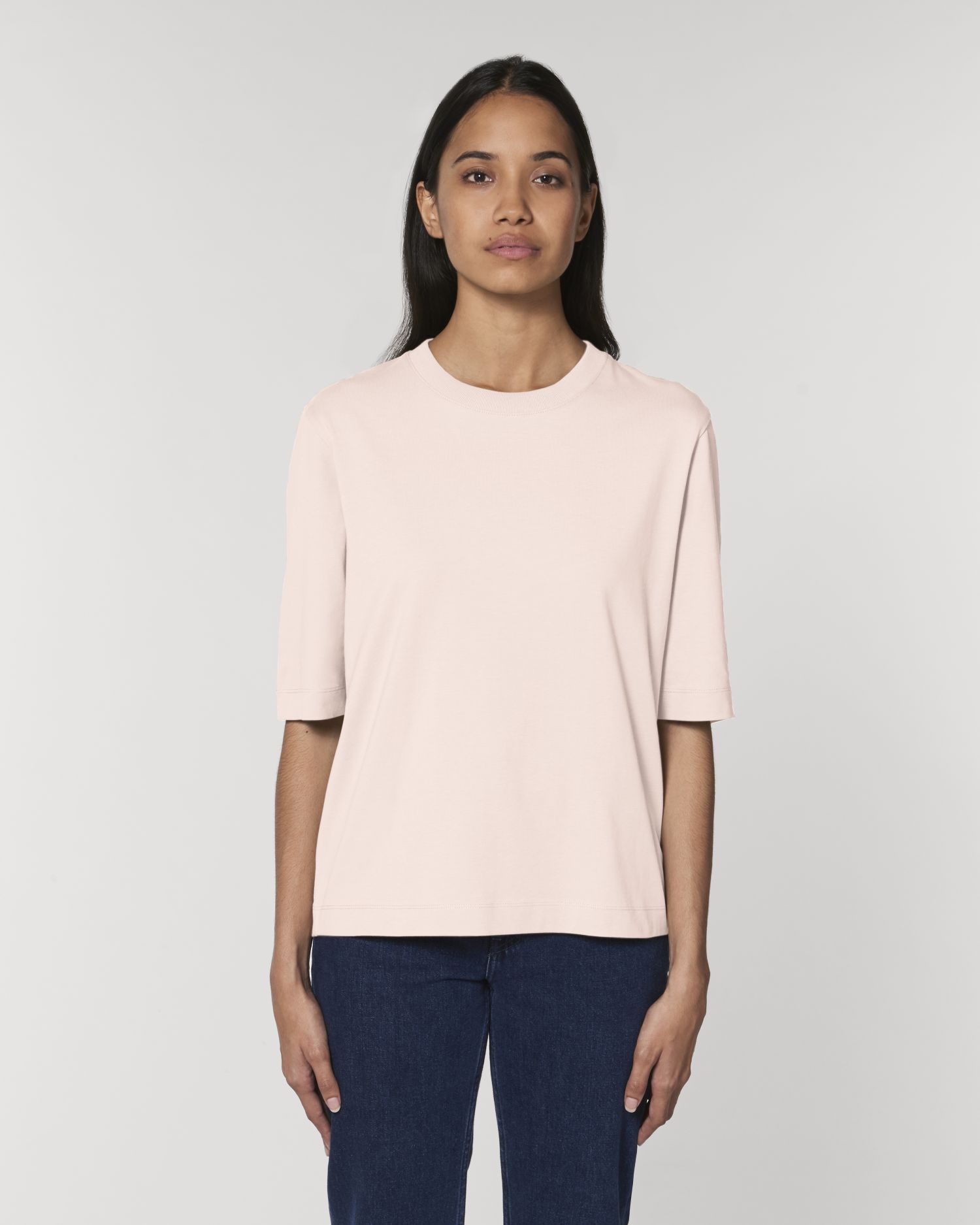 Hrubé, krabicovité tričko pre ňu. Voľný strih, okrúhly výstrih, krátky rukáv, jednoduchý džersejový úplet. Priliehavé rukávy