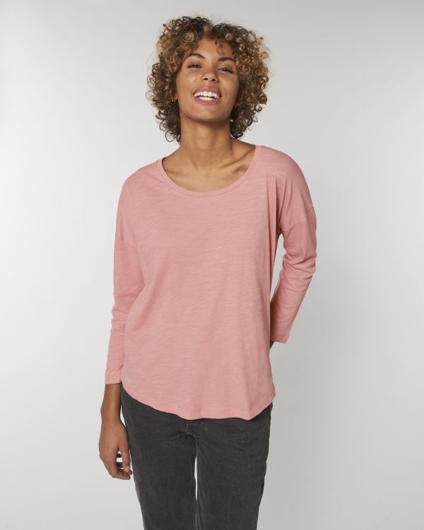 Tričko s 3/4 rukávom pre ňu. Voľný strih, okrúhly výstrih, 3/4 rukáv, jednoduchý džersejový úplet s kĺzavou priadzou. Spadnuté ramená