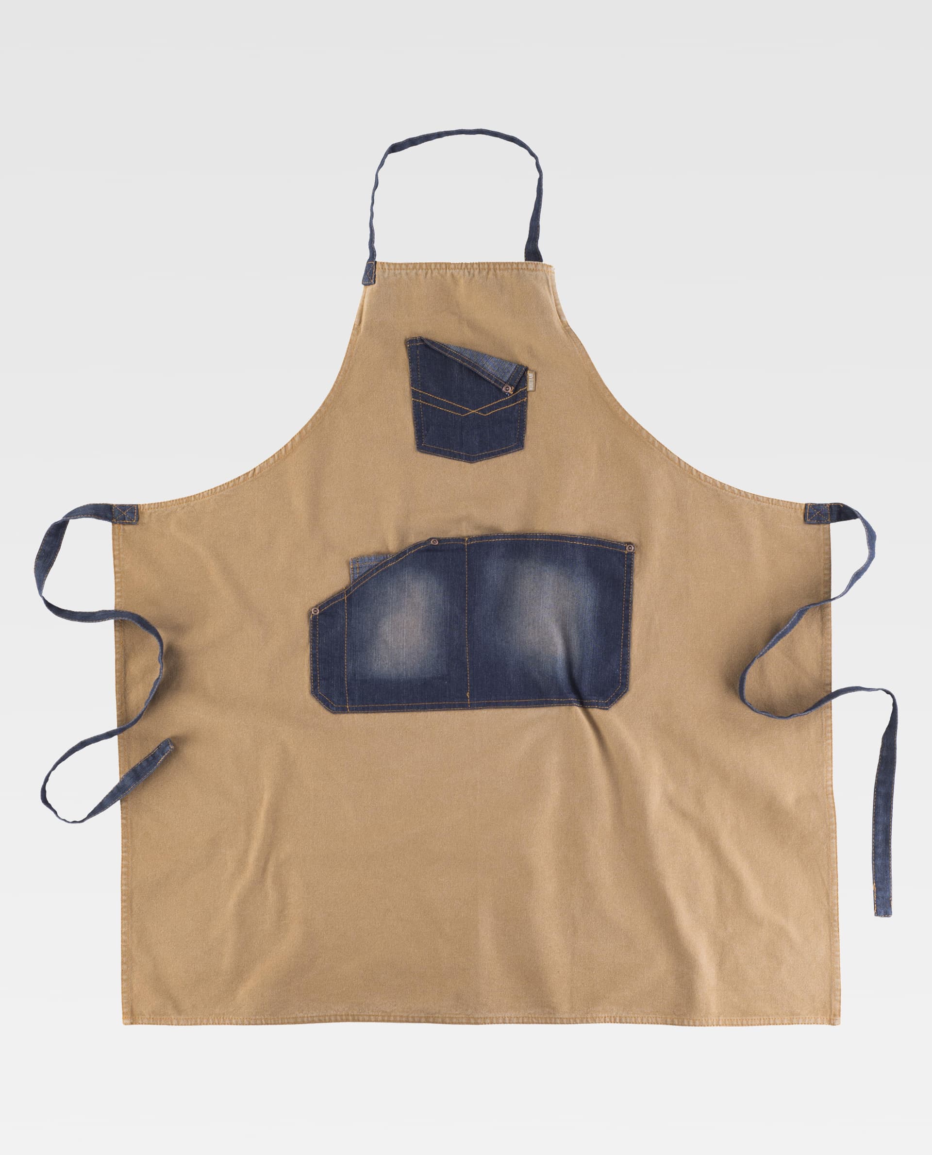 Zástera s náprsenkou z plátna v kombinácii s džínsovinou. Náprsná taška s efektnými švami a asymetrickou centrálnou taškou s priehradkami a vnútorným vreckom na hodinky. Nastaviteľný remienok z džínsoviny s kovovými gombíkmi na krku a stuhami na úpravu pásu. Moderný dizajn s medenými nitmi. Zástera s náprsenkou z plátna v kombinácii s džínsovinou. Náprsná taška s efektnými švami a asymetrickou centrálnou taškou s priehradkami a vnútorným vreckom na hodinky. Nastaviteľný remienok z džínsoviny s kovovými gombíkmi na krku a stuhami na úpravu pásu. Súčasný dizajn s opotrebovanými a medenými nitmi.