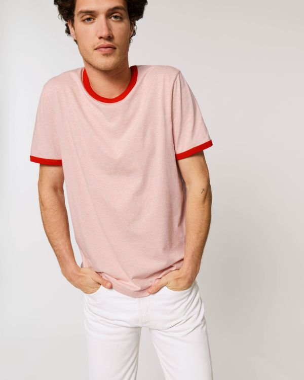 Unisex tričko s kontrastnými okrajmi. Priliehavý strih, okrúhly výstrih, krátky rukáv, jednoduchý džersejový úplet. Uzavretý rukáv Kontrastný 1x1 rebrovaný golier a manžety s dvojitým prešívaním Dvojité prešívanie na leme